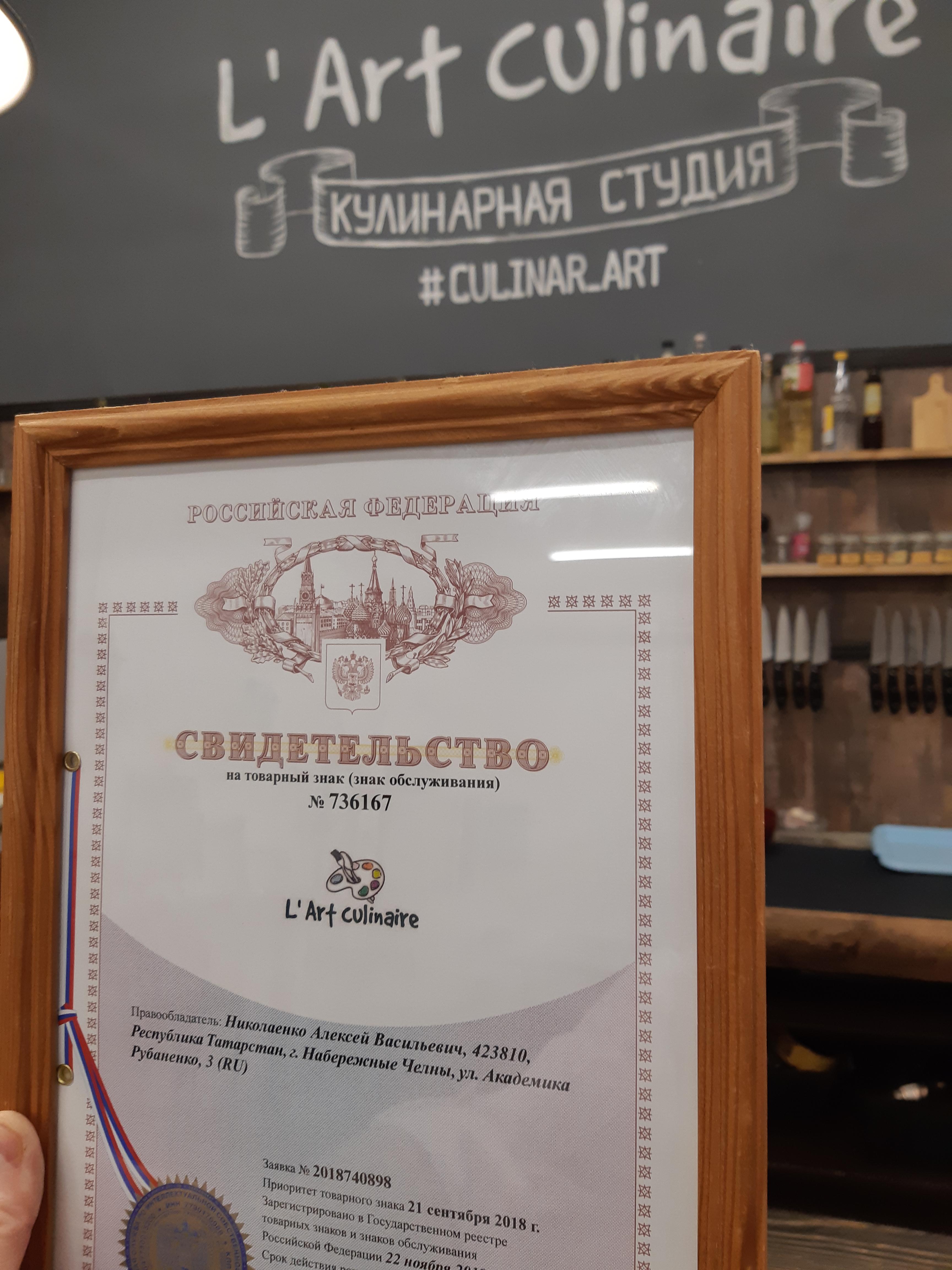 Кулинарная школа-студия «L’ Art culinaire» Наши сайты: artculinar.studio artculinar.online artculinaire.online Основана в 2010 году в г. Набережные Челны, Татарстан, Россия, Фактический адрес местонахождения: 423802, Татарстан, г. Набережные Челны, ул. Рубаненко д.2 Информация о владельце: ИП Николаенко Алексей Васильевич ИНН 165018291311 ОГРН 310165028100288 Тел. 8(8552)78-30-11 ; 89600804554 / ПРАВООБЛАДАТЕЛЬ ТОВАРНОГО ЗНАКА НИКОЛАЕНКО АЛЕКСЕЙ ВАСИЛЬЕВИЧ